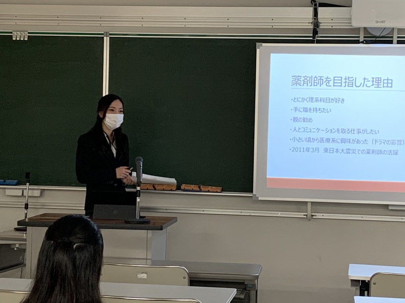 北陸学院高校で11月7日、薬学部への進学を検討している生徒及び保護者を対象とした「薬学志望者のための親子セミナー」が開催されました。セミナーでは、小藤恭子薬学部教授から、薬剤師になるための大学での学びについて説明した後、クラフト株式会社さくら薬局薬剤師の前田明香さん(同校・本学薬学部卒)から、薬剤師の職能や社会的責任、日々の具体的な仕事などについて説明があり、質疑応答では、同校出身の本学薬学部生も加わり、参加者からの様々な質問に答えました。参加したご家族は熱心に聴き入る姿が見られました。