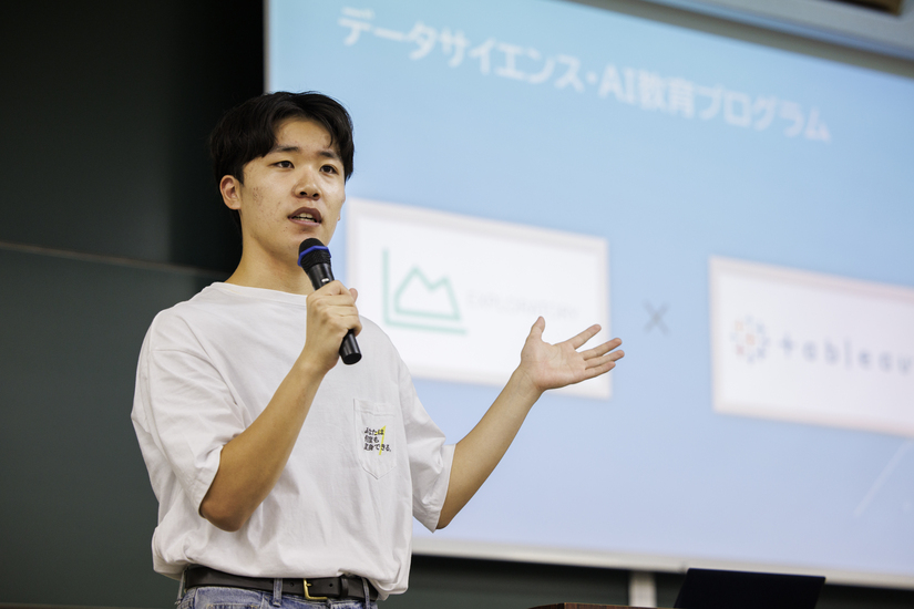 8月11日(金祝)に行われたオープンキャンパスで、経済経営学部3年次生の河上太陽さんが、同学部で活用しているデータ分析ソフト「Tableau(タブロー)」と「Exploratory(エクスプロラトリー)」を用いたデータサイエンス・AI教育の魅力と必要性について説明しました。