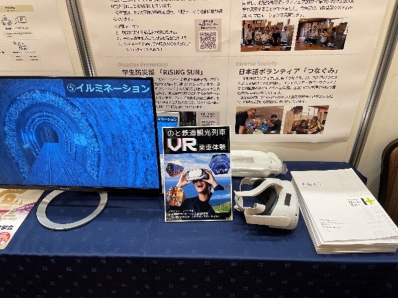 ブースでは、今年4月に開設した健康未来社会実装センターの事業紹介や開設後の取り組み、歩行学習支援ロボットについてパネルと動画等で紹介しました。また、ものづくりLab運営部による北菱電興株式会社とのスマート農業に関する共同研究や大学コンソーシアム石川 地域課題研究ゼミナール支援対象事業の一環として制作したのと鉄道観光列車の風景が楽しめるVRを来場者のみなさまに体験していただきました。その他に、地域連携活動や地域課題解決の取り組み等を紹介し、様々な企業・大学関係者のみなさまに、本学の産学官連携事業について紹介することができました。
