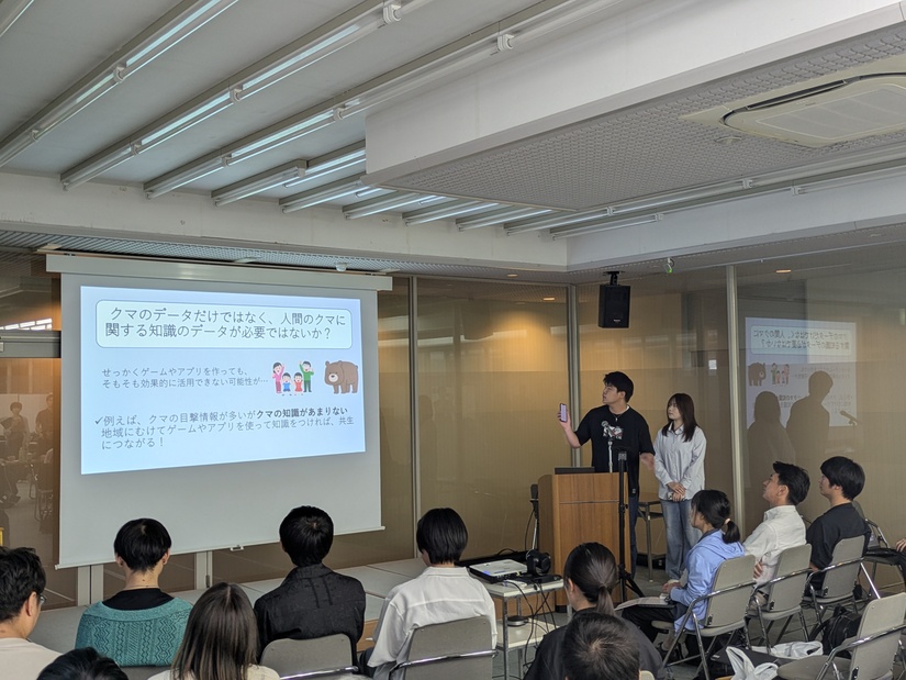 9月27日、石川県地場産業振興センターで開催された「クマ×共生 ハッカソン(成果発表会)」において、データドリブンLabの竹原暖斗さん(経済経営学部経済学科1年次生)、萩原ほのかさん(同学部マネジメント学科1年次生)、溝口依希子さん(同2年次生)の学生チームが、「目撃情報だけでは不十分? 見過ごされがちな『人間のクマに関する知識データ』の必要性」をテーマに発表を行いました。