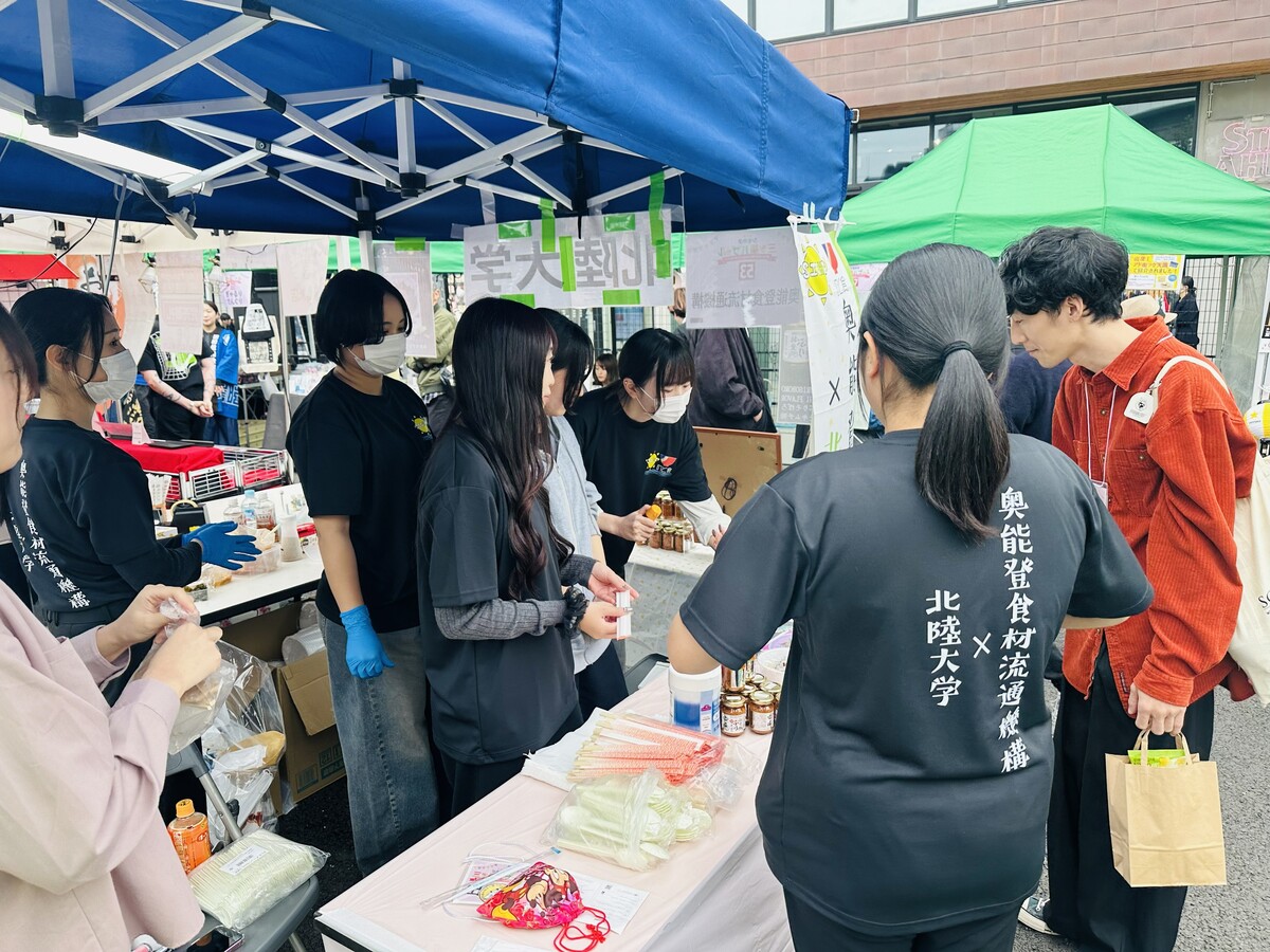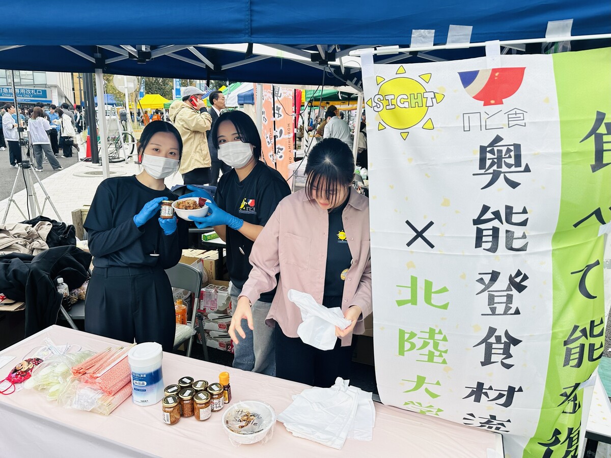 地域や企業と連携しながら地域創生に取り組むサークル「北陸大学SIGHT」は、11月2日(日)〜3日(月・祝)に下北沢駅前広場で開催された「シモキタ三ツ星バザール2025」にて、産学連携プロジェクトを進めている(株)奥能登食材流通機構と共同でブースを出展しました。