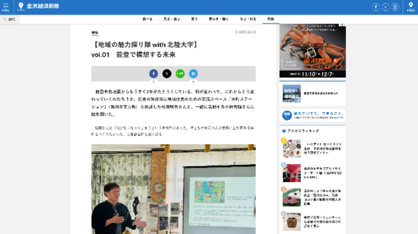 初回の記事は「【地域の魅力探り隊with北陸大学】Vol.01 能登で構想する未来」。地域や企業と連携しながら地域創生に取り組むサークル北陸大学SIGHTの協力を得て取材が実現しました。