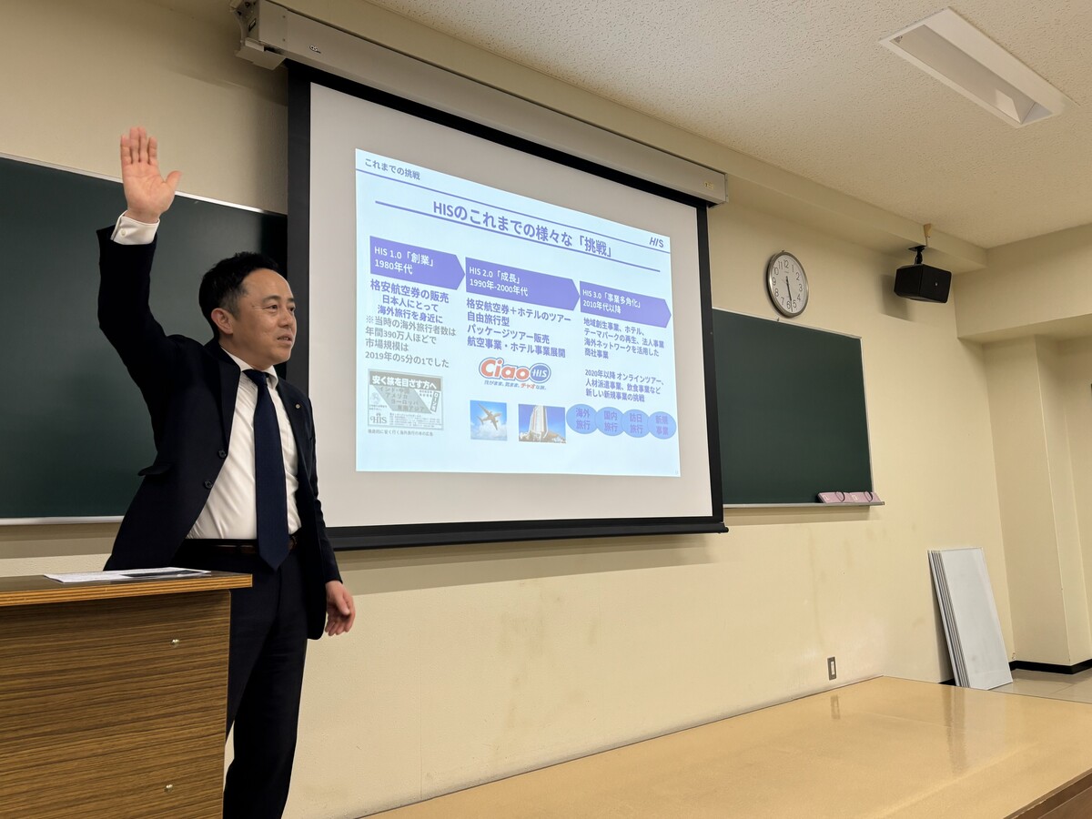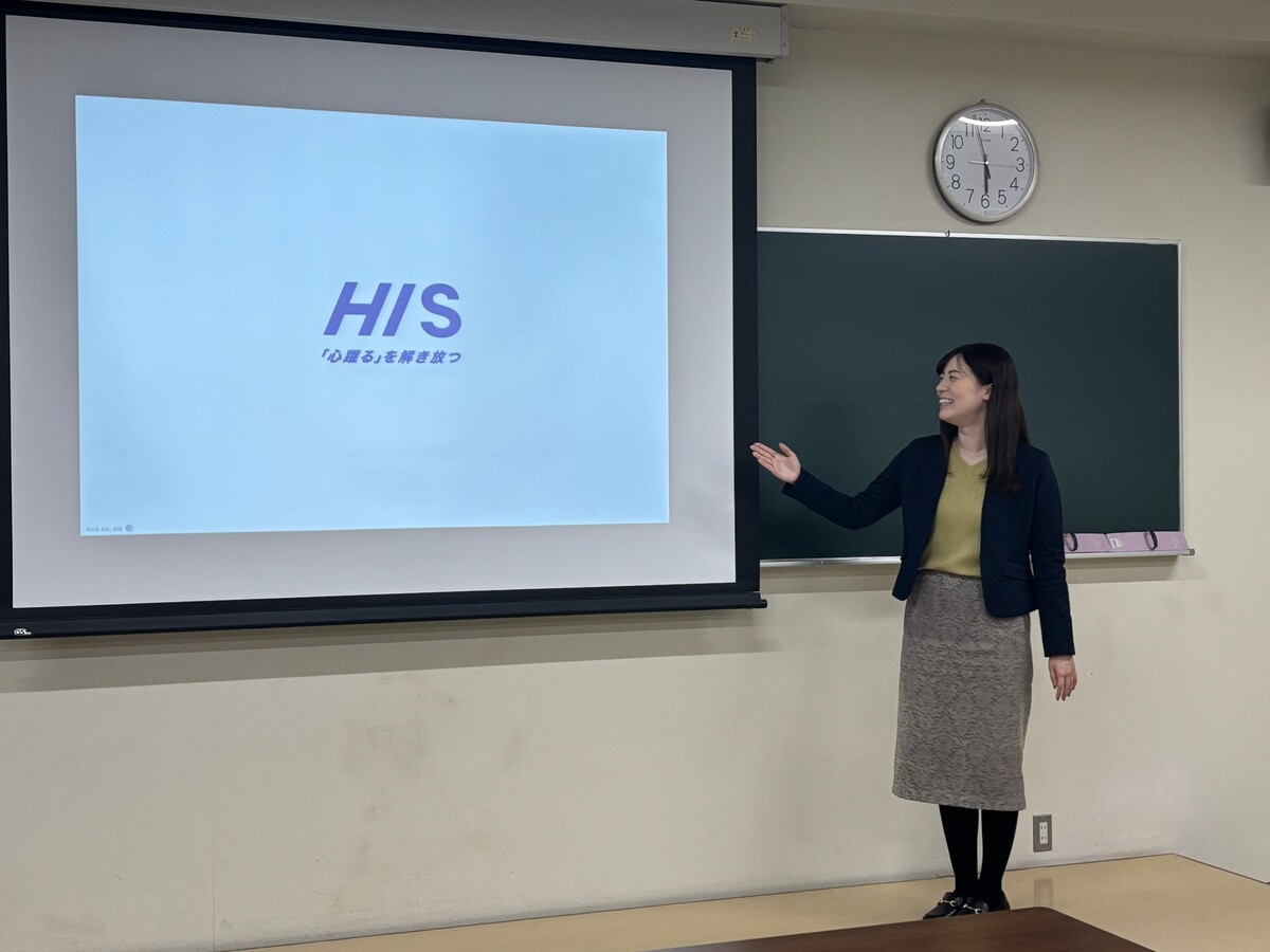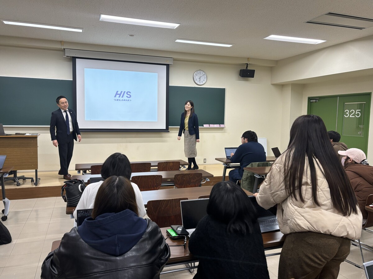 12月23日(火)、国際コミュニケーション学科のキャリア科目「現代社会と職業」において、株式会社エイチ・アイ・エス(HIS)より北陸法人営業チーム・チームリーダーの鈴木滋広氏と岡千尋氏をお招きし、旅行業界の動向と「『心躍る』を解き放つ」を掲げる同社の事業内容についてご講義いただきました。