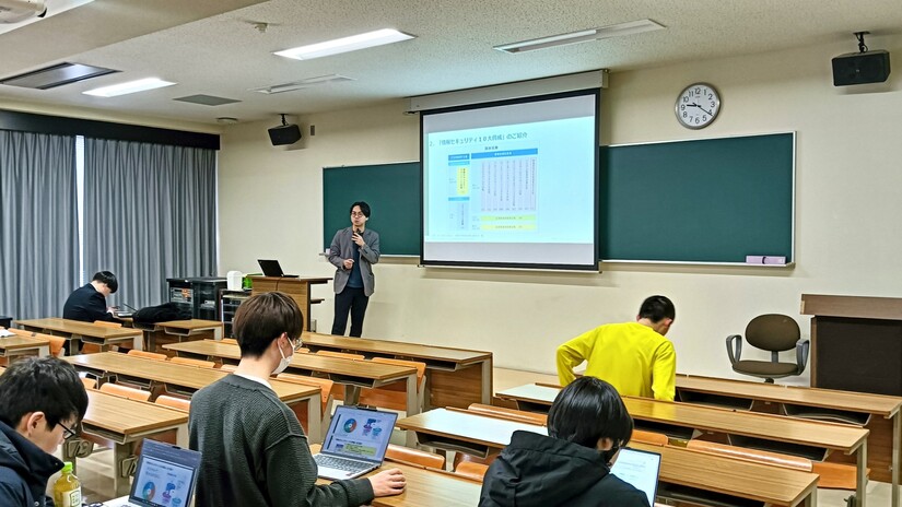 1月9日、経済経営学部経済学科1年次開講科目「金融リテラシー」(担当教員:曽我教授)において、SMBCグループより、SMBCコンシューマーファイナンス株式会社 サイバーセキュリティ統括部の佐藤様ならびに社会的価値創造推進部の坂井様をお招きし、特別講義を実施していただきました。