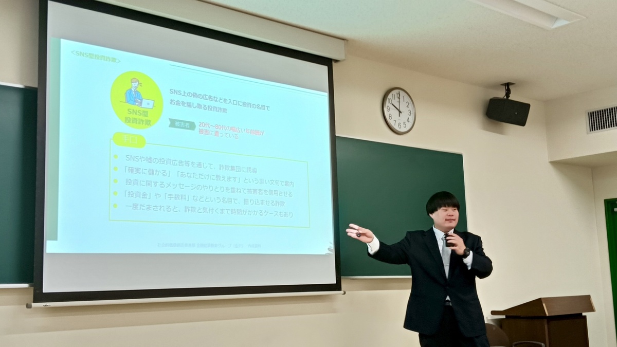 講義では、「なぜ被害に遭ってしまうのか」「どのような点に注意すれば防げるのか」といった視点から、学生が自ら考える場面も設けられ、金融トラブルを“自分ごと”として捉えるきっかけとなりました。