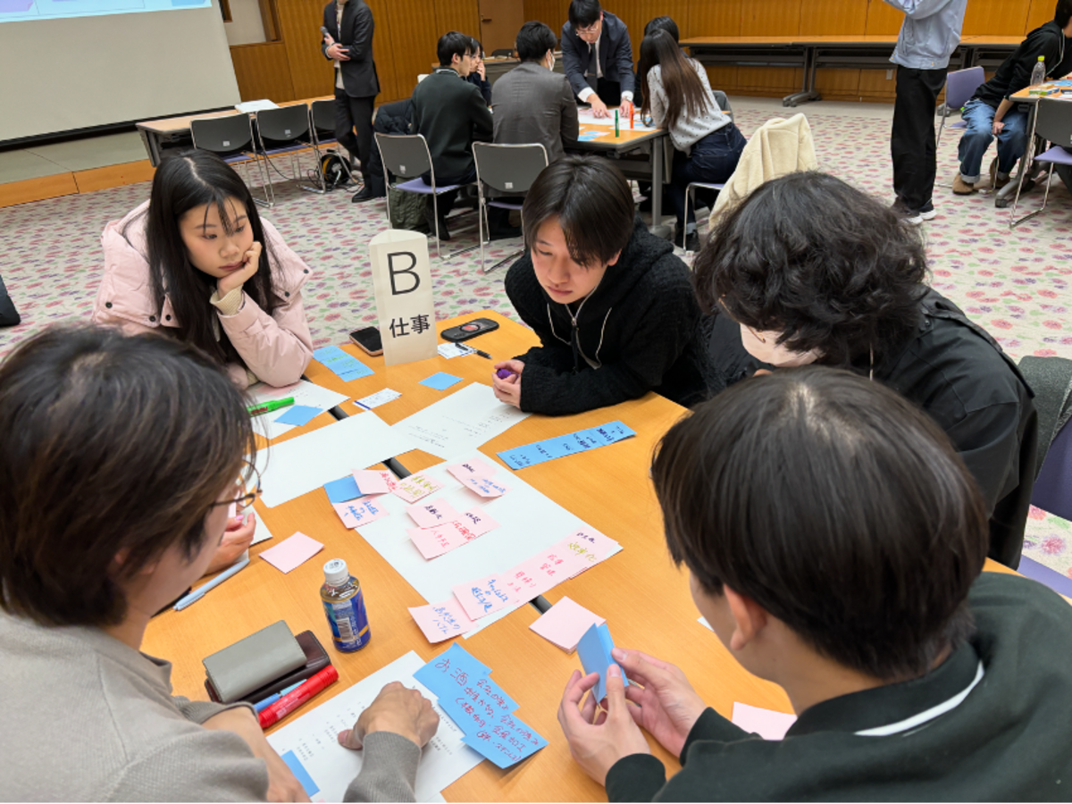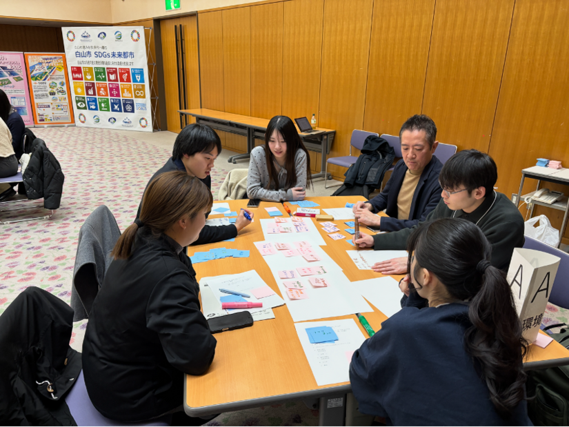 ミーティングでは「環境」「生活」「仕事」の3テーマに分かれ、それぞれの立場から抱く課題や、地域に根ざした解決の可能性について議論を深めました。学生と地元企業が混成チームを組み、付箋を活用して自由にアイデアを出し合うことで、世代や立場の垣根を越えた活発な対話が実現。学生にとっては、教室で学んだSDGsや地域課題を実社会の文脈で捉え直す、貴重な学びの機会となりました。