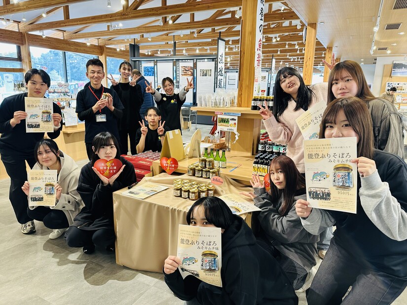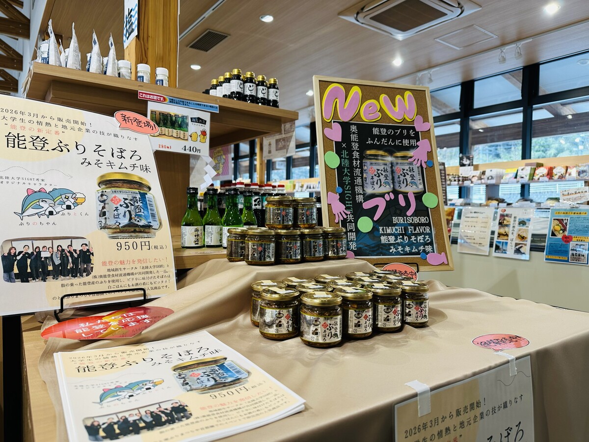 地域や企業と連携しながら地域創生に取り組むサークル「北陸大学SIGHT」は、株式会社奥能登食材流通機構とイカの駅つくモールと共催により、「能登ぶりそぼろ」販売記念イベントをイカの駅つくモールにて開催しました。